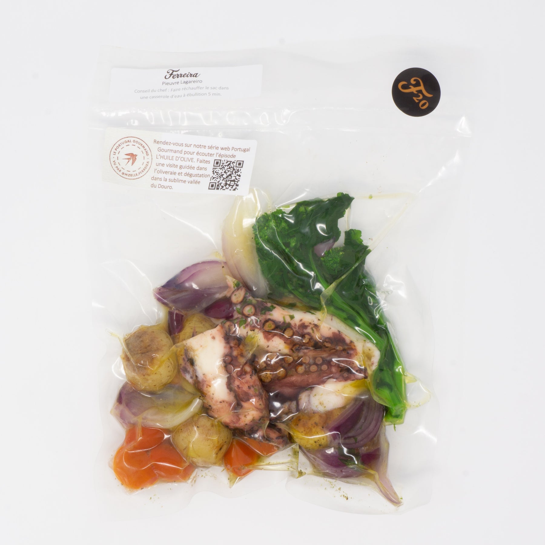 Pieuvre lagareiro, huile d'olive F, oignons confits, pommes grelots, tomates cerises & romarin.